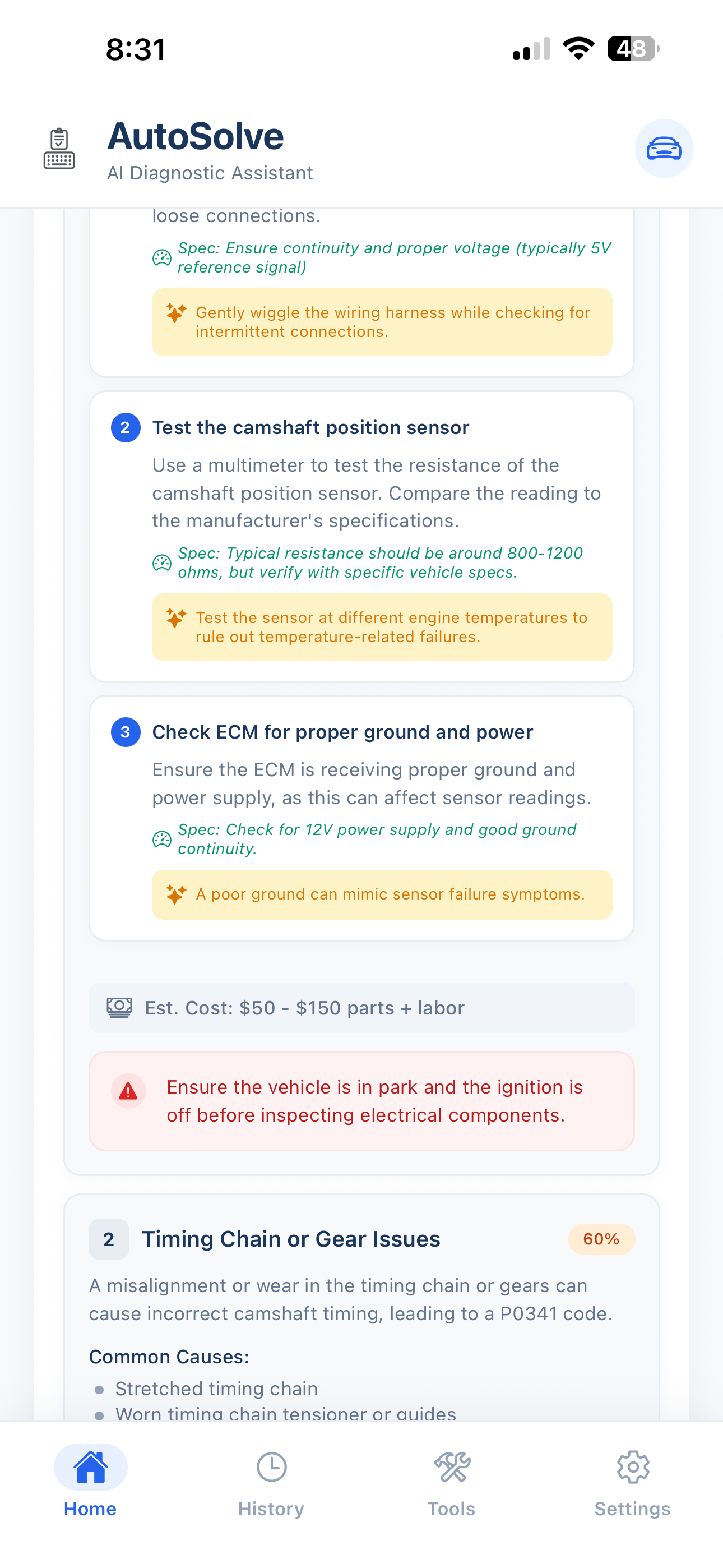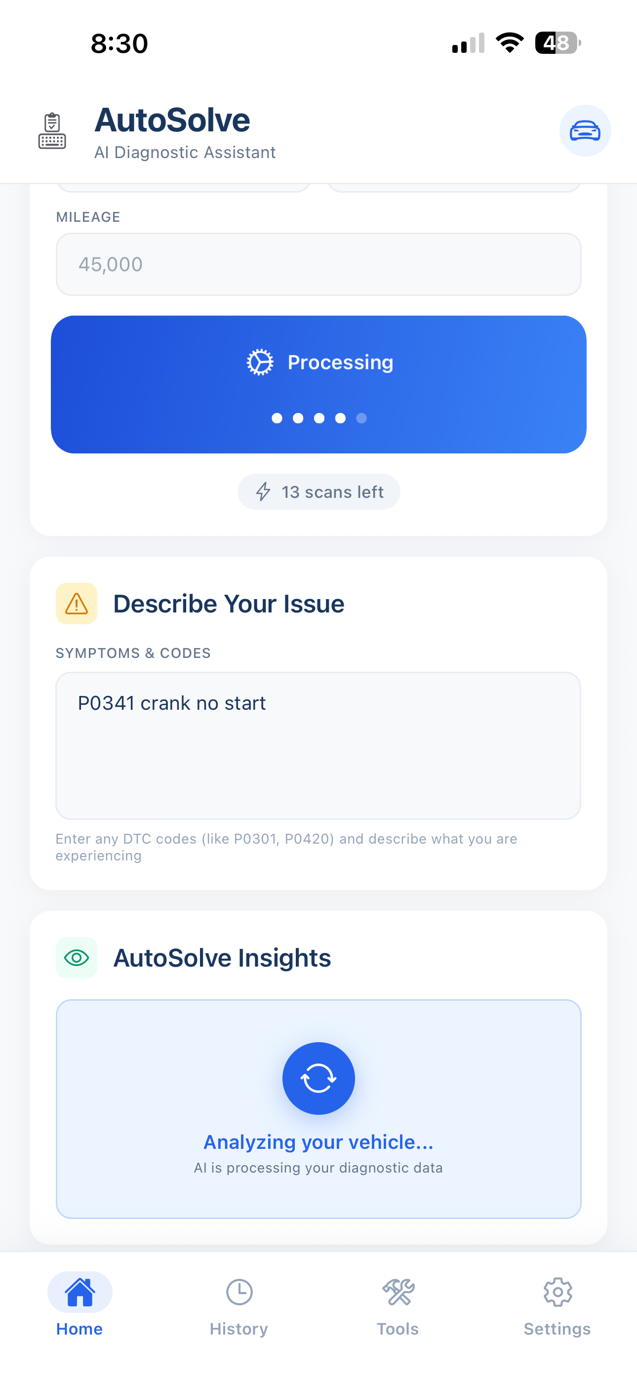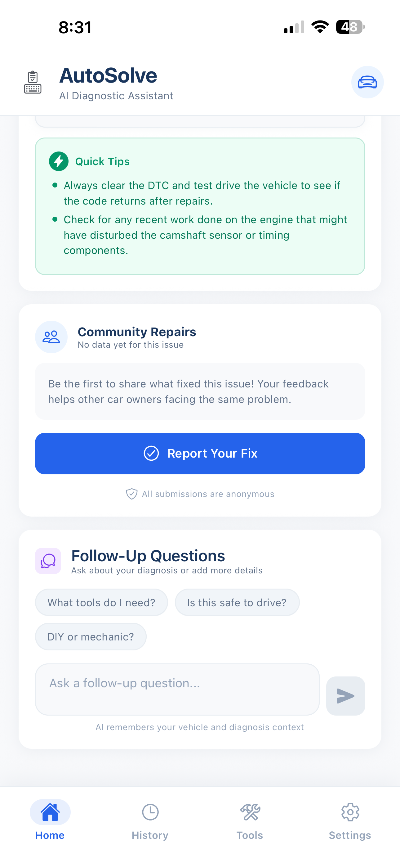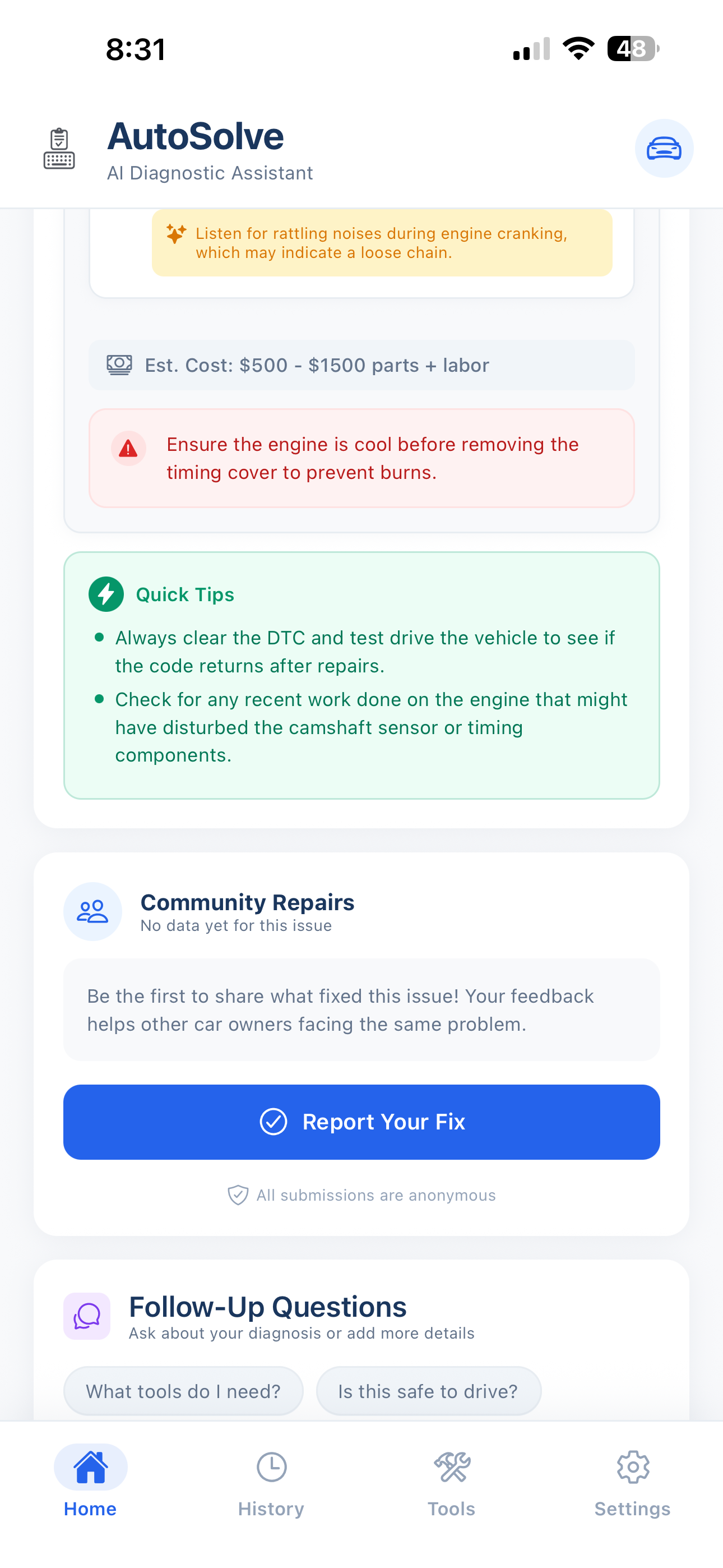 Stop guessing parts. AutoSolve uses GPT-4 to analyze symptoms, OBD-II codes, and crowdsourced repair data to tell you exactly what's wrong and how to fix it.
